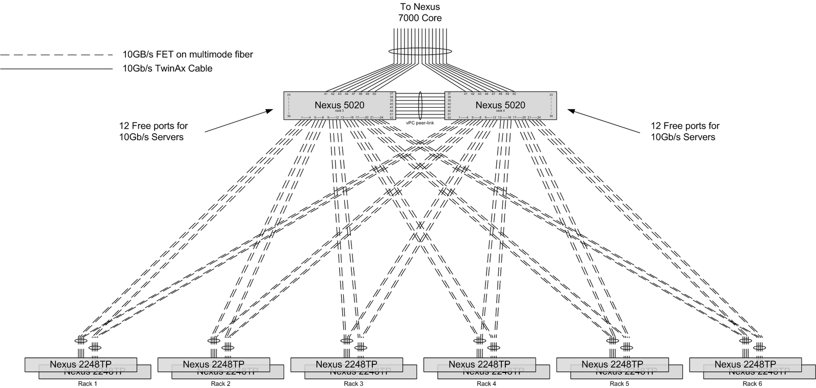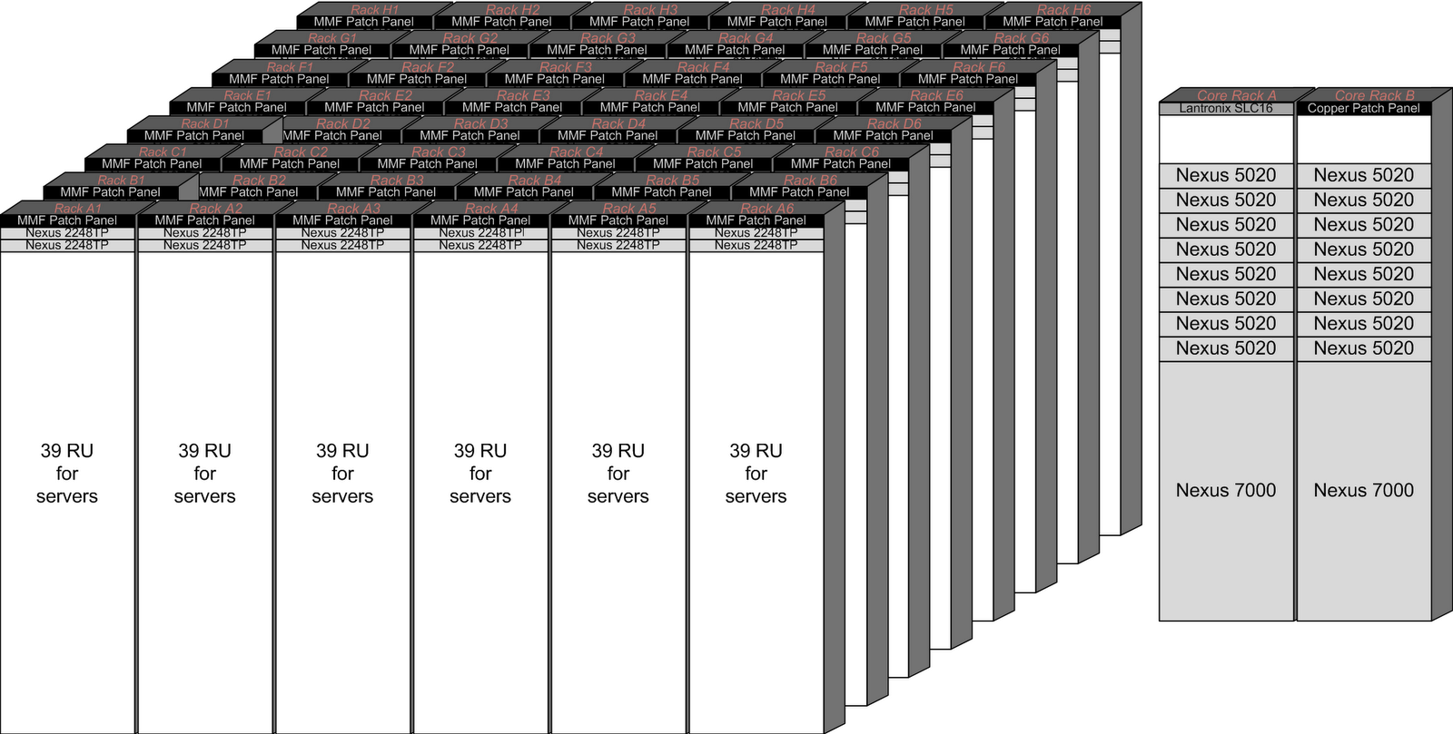 Last year I put the Nexus 5020s into the server row, using the inexpensive twinax cables for 5000->2000 downlink. That decision saved 10% of the project budget, and seemed so cutting edge at the time. But the FET has made that layout obsolete. The 5020s get centralized now.