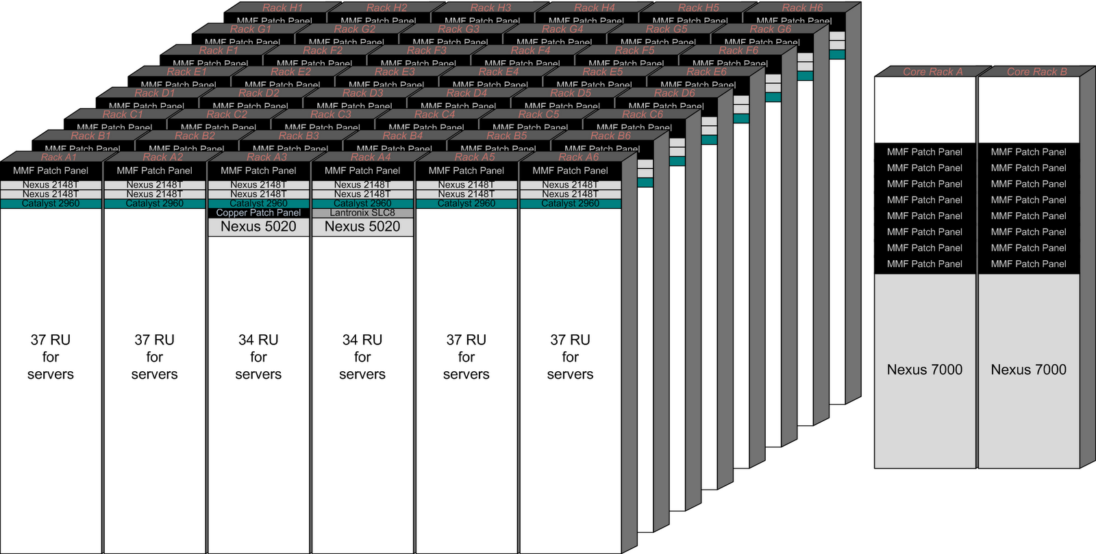 - Flexible layout: We're no longer constrained to a 6-rack row length by the 5000->2000 CX1 cables. FEXes can live anywhere in the data center. I've left the layout alone for a straightforward comparison.