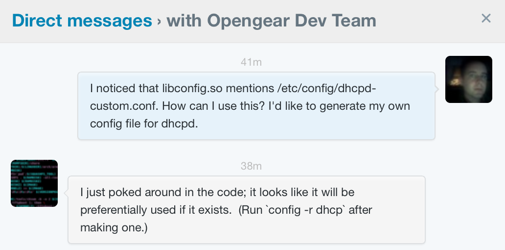 The Opengear web UI doesn't offer too many DHCP service configuration options, but I didn't expect that to be a problem. One of the things I love about Opengear is that most anywhere you look, the baked-in scripts and configuration elements can be replaced with user-supplied versions of those things.