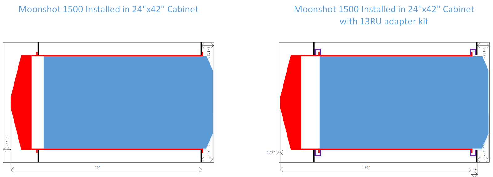 Because the 13U adapter rails mount inboard of the cabinet posts, they don't impact the location of the chassis in the cabinet at all. The cold side protrusion of the chassis is still about 2-3/16"  They do, however move the server's rails and cable management stuff about an inch toward the hot side of the cabinet because the rails are now attached to the "C" channel, rather than the front of the cabinet. This increases the rearward protrusion from 38" to 39" and makes the whole package a bit over 41" long. It'll fit in a 42" cabinet, but only just.